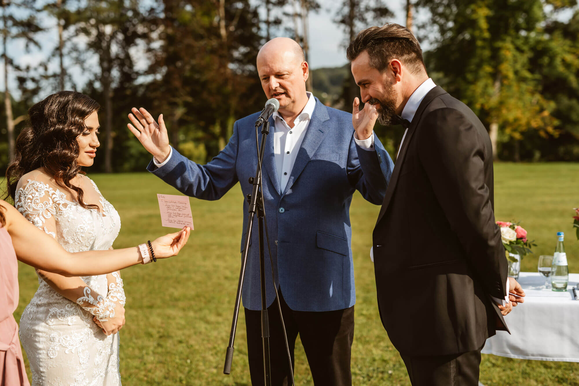 Ganz klar: Bernd schreibt eine Rechnung. Das gehört dazu. Aber für Lisa und Jan ist klar, dass so eine Atmosphäre wie an ihrer Hochzeit einen Wert hat, der nicht mit Geld zu bezahlen ist. Bernd stimmt dem lächelnd zu und betont, dass es ja ihre Liebe selbst war, die diesen Zauber hat entstehen lassen. Und dass er sich selbst als eine Art Schatzsucher sieht, der in dem ganzen Prozess der Vorbereitung auf die Suche nach Diamanten geht, die dann an der Feier strahlen können. Und dies sei bei Lisa und Jan einfach ganz bezaubernd gelungen. Und dass es keine Selbstverständlichkeit sei. Schließlich bietet er ihnen noch an, dass er auch in Zukunft als Coach und Begleiter für sie da sein möchte, wenn sie das auch wollen. Das freut Lisa und Jan, denn sie mögen Bernd als Mensch und haben ihn als kompetenten Begleiter kennen gelernt. Bei Bedarf würden sie wieder auf ihn zukommen und ihn als Hochzeitsredner in jedem Fall weiterempfehlen.