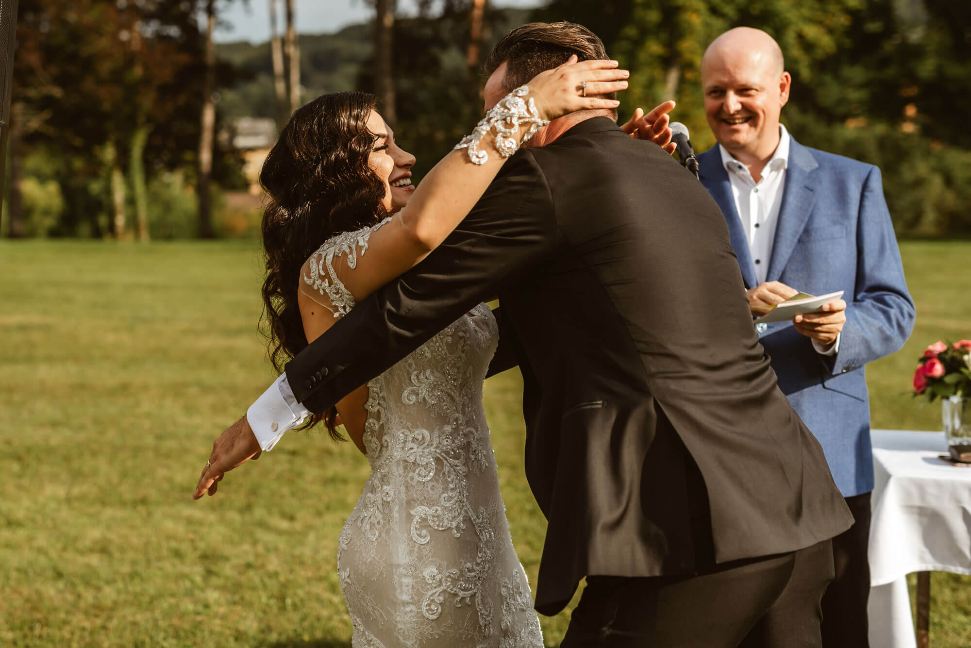 Endlich ist der große Tag gekommen: Lisa und Jan waren donnerstags auf dem Standesamt. Das war ganz schön. Aber jetzt ist Samstag 14.00 h – um 15.30 h soll die freie Trauungszeremonie stattfinden. Beide sind ganz aufgeregt. Die Familie und Freunde versuchen zu beruhigen, aber das Adrenalin schießt hoch. Bernd ist um 14.00 h auch schon da und koordiniert noch einmal die Abläufe mit der Location und dem Musiker. Er hat einen Ablaufplan erstellt, den das Paar, die Location, der Musiker und die Trauzeugen erhalten. Und dann geht es endlich los. Gott sei Dank hat das Wetter gehalten, und sie können die freie Trauung draußen auf der Wiese unter den weißen Pavillons zelebrieren. Der Sektempfang lockert das Ganze schon etwas auf. Und dann um Punkt 15.30 h beginnt die Zeremonie. Als Lisa Arm in Arm mit ihrem Vater in ihrem bezaubernden Brautkleid in die Feier einzieht, sind die Emotionen kaum mit Worten zu beschreiben. Jan ist völlig überwältigt, als er sie sieht. - Die folgende Zeremonie ergreift alle. Es wird gelacht, und es fließen Tränen. Die Rede von Bernd nimmt alle mit. Lisa und Jan schauen sich die ganze Zeit an und können durch Bernds Worte ihre Liebe in diesem Moment ganz tief fühlen. Sie fühlen sich von der ganzen Atmosphäre getragen; alle sind dabei. Als sie sich dann das Ja-Wort geben, wird es kurz ganz still, obwohl die Spannung einen fast den Atem anhalten lässt. Die Atmosphäre hat was ergreifendes. Als sie sich dann küssen, bricht ein emotionales Feuerwerk bei allen Hochzeitsgästen aus. Es ist einfach wunderschön und alle fühlen: das ist wahre Liebe!